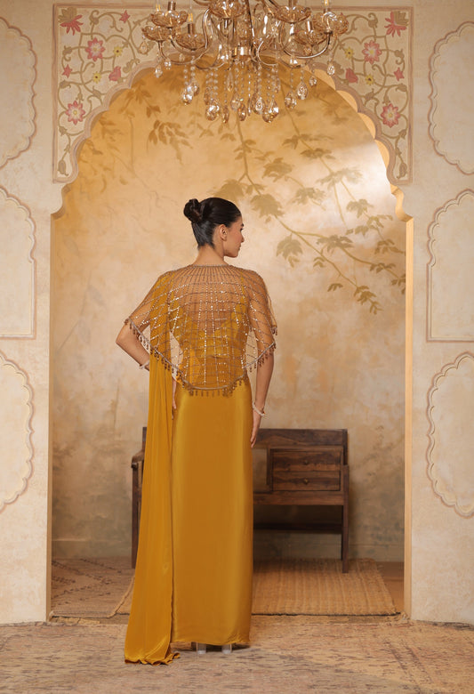 Golden Yellow Crepe Saree with Designer Cape - Premium Haldi Wear