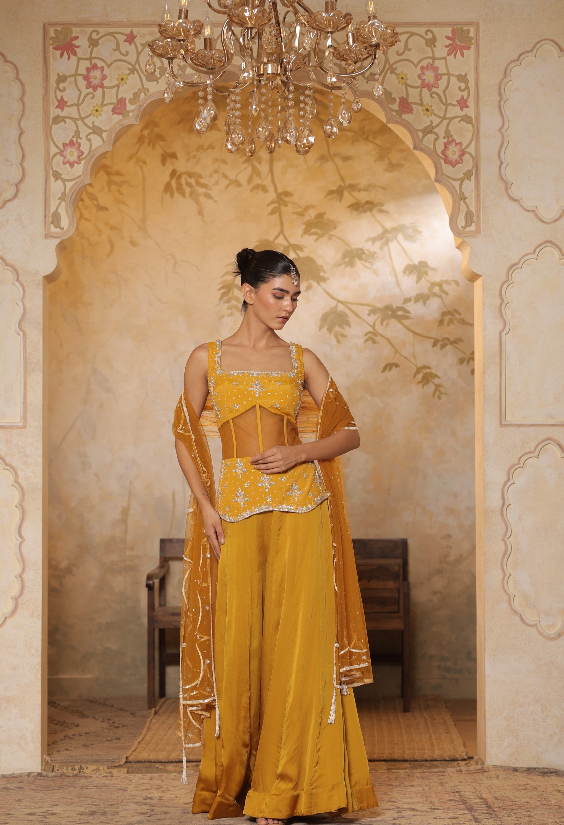 Shine in the Golden Yellow Satin Organza Draped Sharara with Silk Crepe Embroidered Co-Set Top and Dupatta by Sunanta Madaan. Perfect Indo-Western fusion outfit for weddings, festive occasions, and designer party wear.