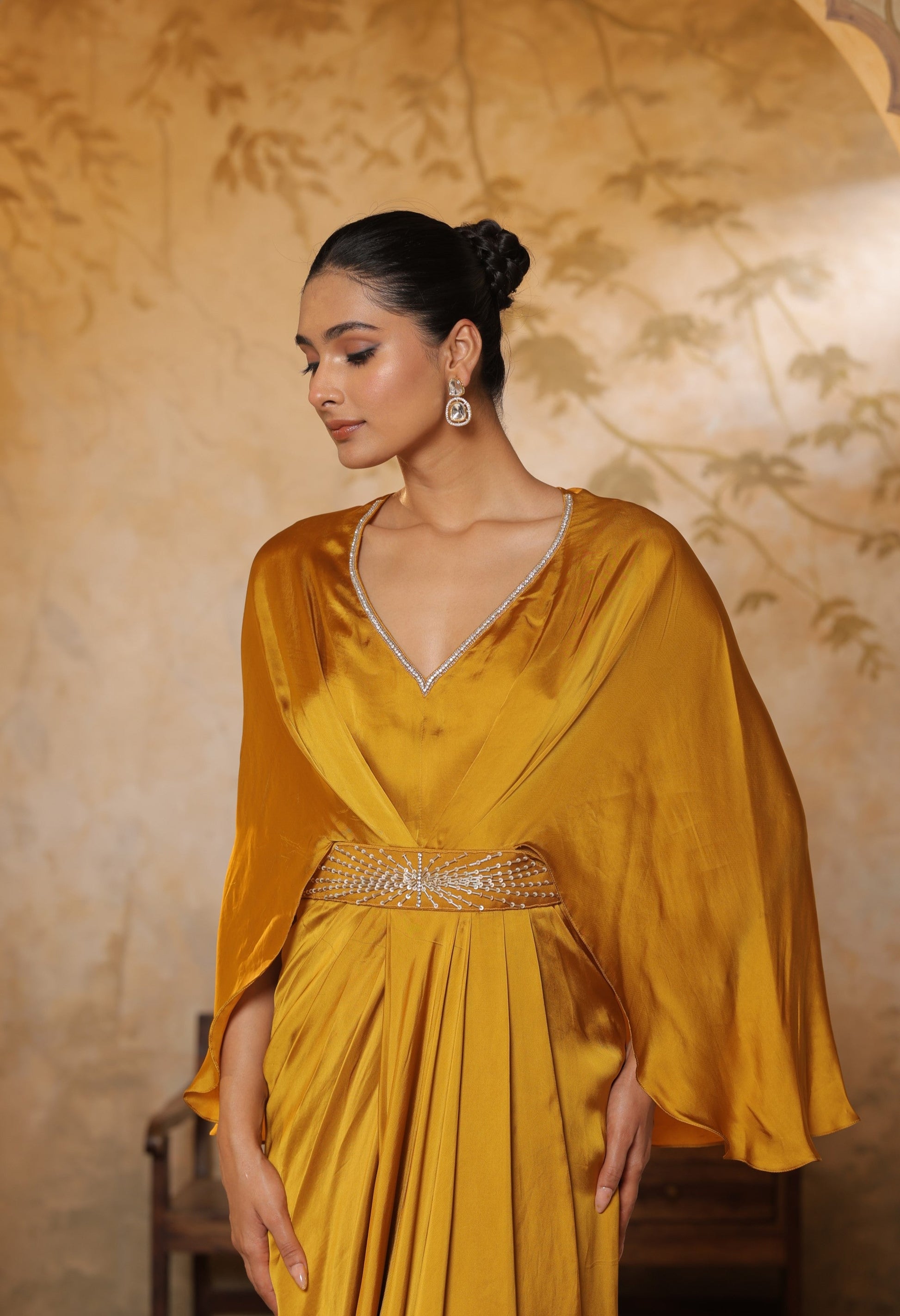 Radiate elegance and grace with the Sunanta Madaan Yellow Crepe V-Neck Embroidered Kaftan Dress. This stunning dress combines the softness of crepe fabric with exquisite embroidery, creating a perfect blend of traditional artistry and modern design. The flattering V-neckline enhances the silhouette, while the vibrant yellow hue adds a touch of sunshine to any occasion. Ideal for semi-formal gatherings, Haldi Celebration, festive celebrations, or even a stylish day out, this kaftan dress offers effortless charm and comfort.